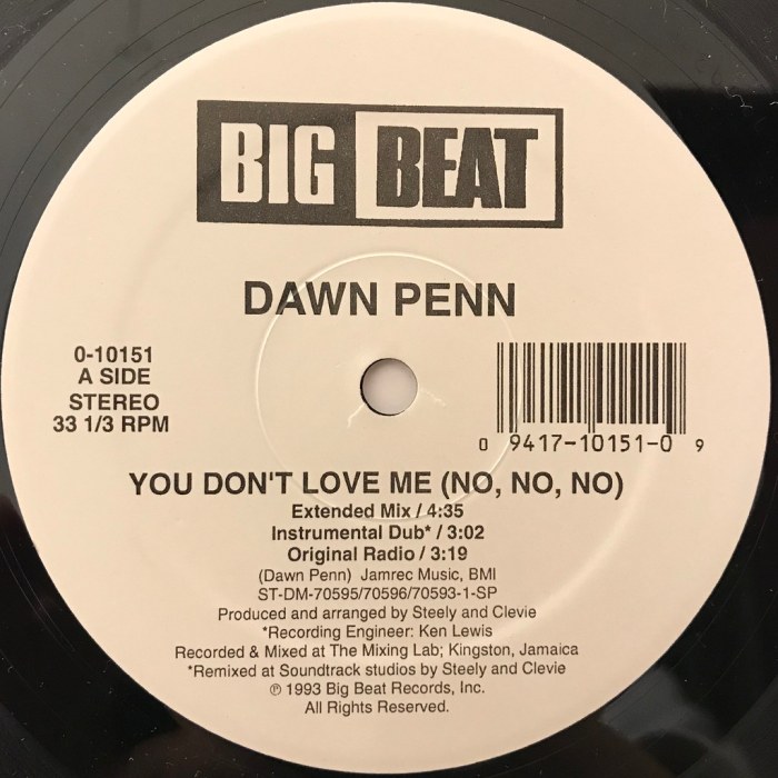 “No No No” became a huge hit for Dawn Penn and became her signature song. It became a #1 song on the Jamaican Music charts and reaching as far as #3 on the UK Music charts. It also made it to the music charts in Japan, Canada, and many areas in Europe. The song was so popular that it has been sampled and covered by many artists including Jae Millz, Ghostface Killah, Rihanna, Lily Allen, Eve, and many others. Dawn Penn went on to release an album of the same name and included the hit, the album went on to receive a Grammy nomination.